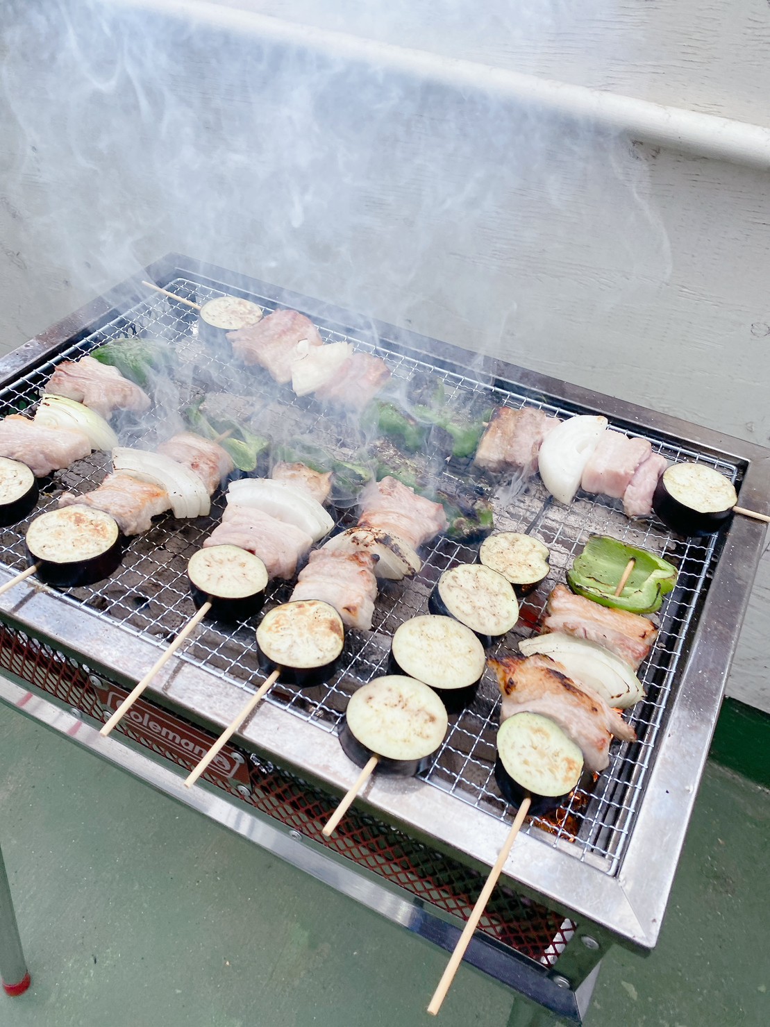 ③BBQコンロでシュラスコ風BBQ(串刺しの牛肉、豚肉、野菜)