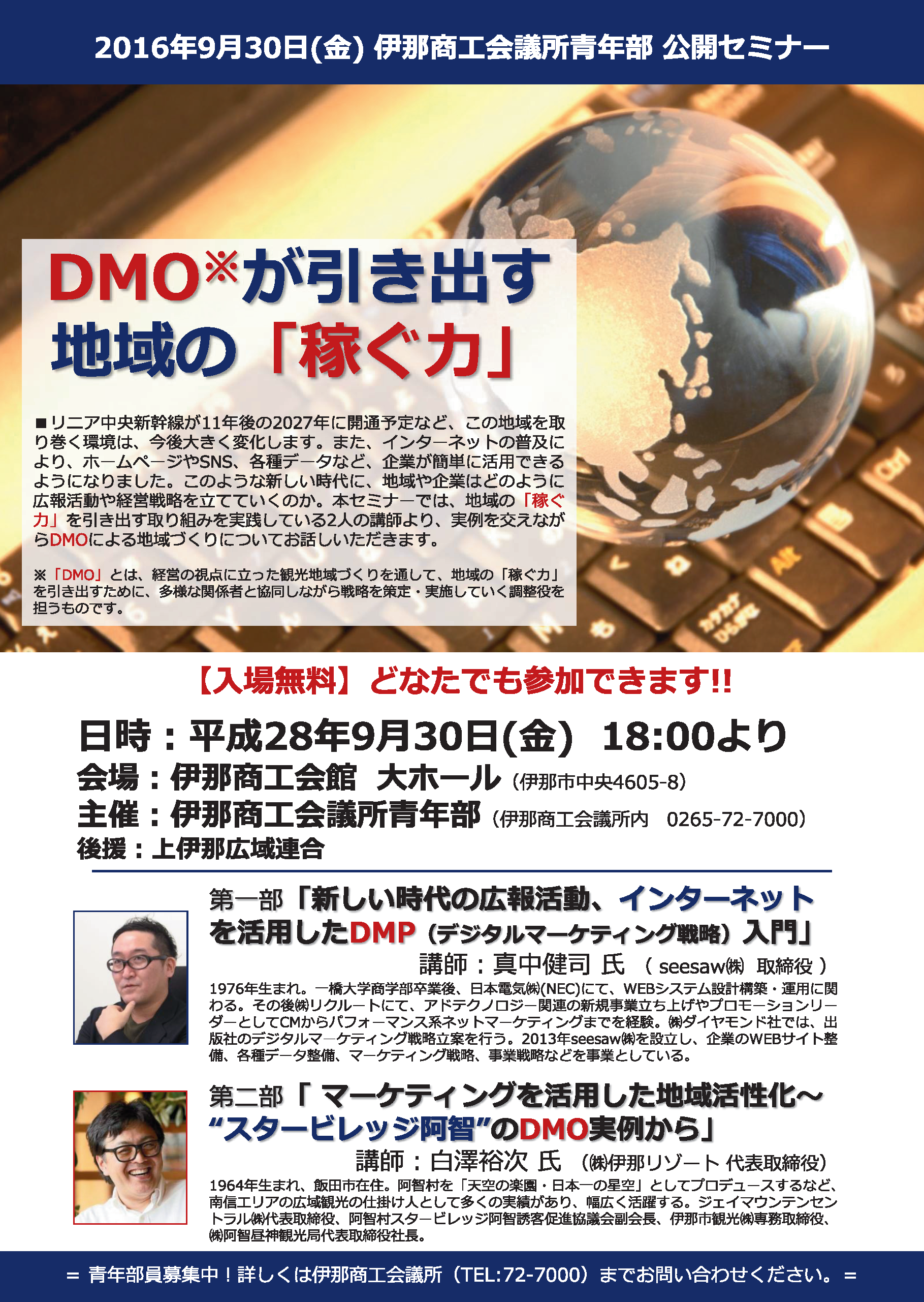 9月30日(金)、伊那商工会議所青年部は9月例会として、公開セミナー「DMOが引き出す地域の「稼ぐ力」」を開催します。青年部員以外の一般の方、どなたでも参加できる無料セミナーです。ぜひ会場にお越しください。詳しくは、以下の内容をご参照ください。