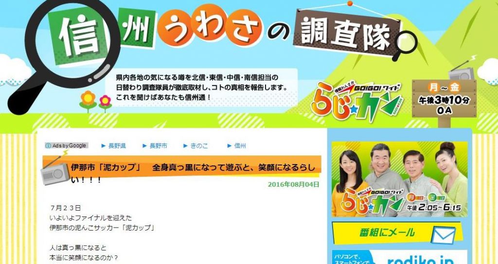 8月4日放送のSBCラジオ「らじ★カン」のコーナー「信州うわさの調査隊」で、7月23日に開催した「どろカップファイナル」の内容が紹介されました。 http://radikanchosatai.naganoblog.jp/d2016-08-04.html -