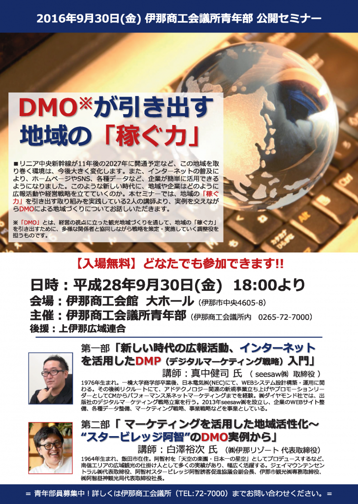 9月30日(金)、伊那商工会議所青年部は9月例会として、公開セミナー「DMOが引き出す地域の「稼ぐ力」」を開催します。青年部員以外の一般の方、どなたでも参加できる無料セミナーです。ぜひ会場にお越しください。詳しくは、以下の内容をご参照くださ... -